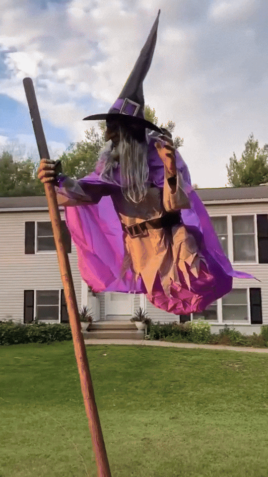 Bring your Halloween decorations to the next level with a life-size flying witch thatglows, moves, and reacts to nearby sounds.With every eerie laugh and swoop across the yard, shedraws attention and creates unforgettable moments.